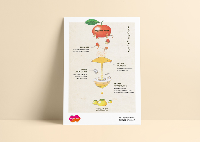 「magenta mikan」ブランド。LOGOやみかんチョコ・みかんチョコクランチのパッケージ、ポスター・チョップカード・名刺など、デザインさせていただきました。